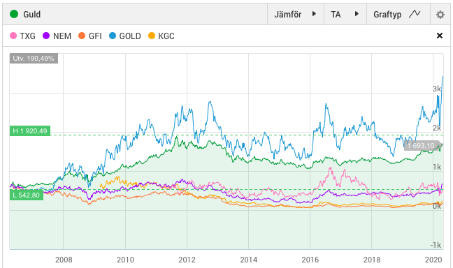 Jämförelse på Avanza av guldpriset och fem guldbolag.